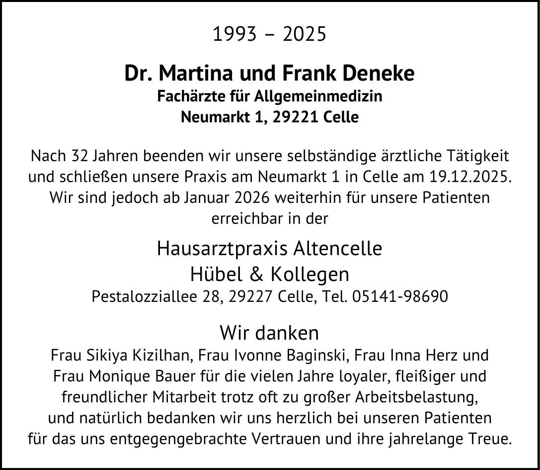 und schließen unsere Praxis am Neumarkt 1 in Celle am 19.12.2025.