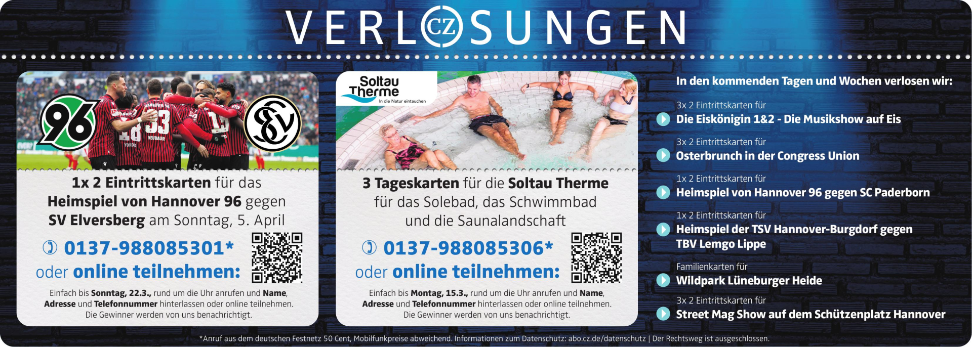 *Anruf aus dem deutschen Festnetz 50 Cent, Mobilfunkpreise abweichend. Informationen zum Datenschutz: abo.cz.de/datenschutz | Der Rechtsweg ist ausgeschlossen.
