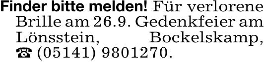 Finder bitte melden! Für verloreneBrille am 26.9. Gedenkfeier am