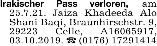 Irakischer Pass verloren, am
