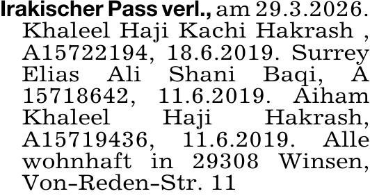 Irakischer Pass verl., am 29.3.2026.Khaleel Haji Kachi Hakrash