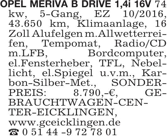 OPEL MERIVA B DRIVE 1,4i 16V 74kw, 5-Gang, EZ 10/2016,