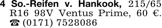 4 So.-Reifen v. Hankook, 215/65R16 98V Ventus Prime, 60 €.