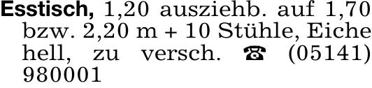 Esstisch, 1,20 ausziehb. auf 1,70bzw. 2,20 m + 10 Stühle, Eiche