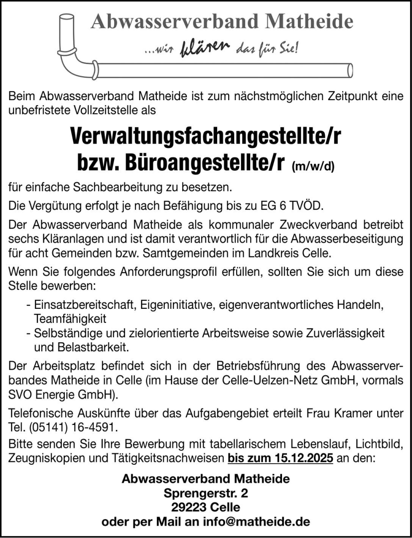 Beim Abwasserverband Matheide ist zum nächstmöglichen Zeitpunkt eine