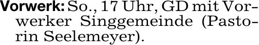 Vorwerk: So., 17 Uhr, GD mit Vor-werker Singgemeinde (Pasto-