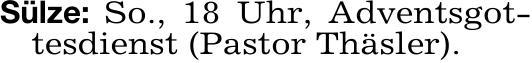 Sülze: So., 18 Uhr, Adventsgot-tesdienst (Pastor Thäsler).