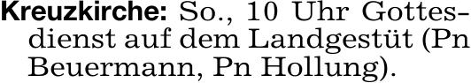 Kreuzkirche: So., 10 Uhr Gottes-dienst auf dem Landgestüt (Pn