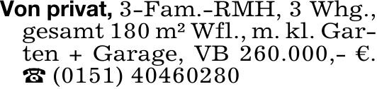 Von privat, 3-Fam.-RMH, 3 Whg.,gesamt 180 m² Wfl., m. kl. Gar-
