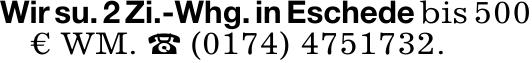 Wir su. 2 Zi.-Whg. in Eschede bis 500€ WM. (0174) 4751732.