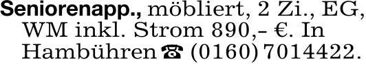 Seniorenapp., möbliert, 2 Zi., EG,WM inkl. Strom 890,- €. In
