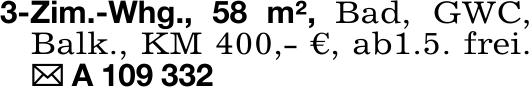 3-Zim.-Whg., 58 m², Bad, GWC,Balk., KM 400,- €, ab1.5. frei.