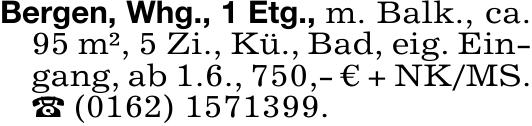 Bergen, Whg., 1 Etg., m. Balk., ca.95 m², 5 Zi., Kü., Bad, eig. Ein-