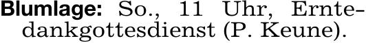 Blumlage: So., 11 Uhr, Ernte-dankgottesdienst (P. Keune).