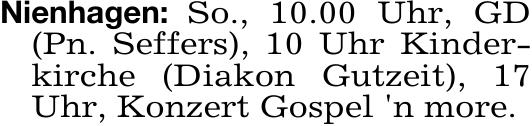 Nienhagen: So., 10.00 Uhr, GD(Pn. Seffers), 10 Uhr Kinder-