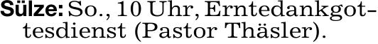 Sülze: So., 10 Uhr, Erntedankgot-tesdienst (Pastor Thäsler).