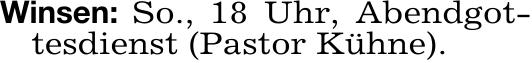 Winsen: So., 18 Uhr, Abendgot-tesdienst (Pastor Kühne).
