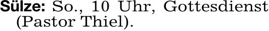 Sülze: So., 10 Uhr, Gottesdienst(Pastor Thiel).