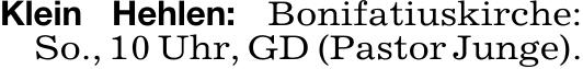 Klein Hehlen: Bonifatiuskirche:So., 10 Uhr, GD (Pastor Junge).