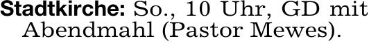 Stadtkirche: So., 10 Uhr, GD mitAbendmahl (Pastor Mewes).