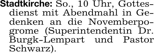Stadtkirche: So., 10 Uhr, Gottes-dienst mit Abendmahl in Ge-