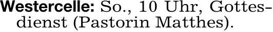 Westercelle: So., 10 Uhr, Gottes-dienst (Pastorin Matthes).