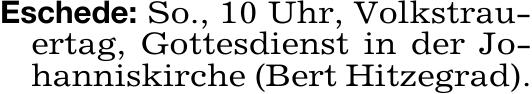 Eschede: So., 10 Uhr, Volkstrau-ertag, Gottesdienst in der Jo-