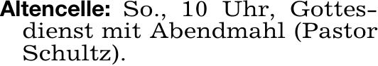 Altencelle: So., 10 Uhr, Gottes-dienst mit Abendmahl (Pastor