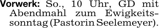 Vorwerk: So., 10 Uhr, GD mitAbendmahl zum Ewigkeits-