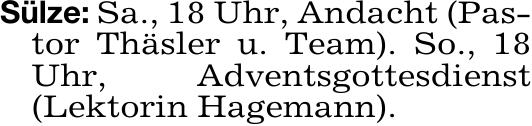 Sülze: Sa., 18 Uhr, Andacht (Pas-
