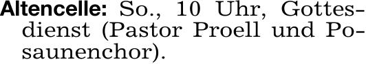 Altencelle: So., 10 Uhr, Gottes-dienst (Pastor Proell und Po-