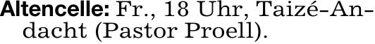 Altencelle: Fr., 18 Uhr, Taizé-An-dacht (Pastor Proell).