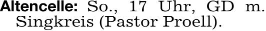 Altencelle: So., 17 Uhr, GD m.Singkreis (Pastor Proell).