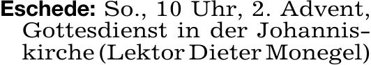 Eschede: So., 10 Uhr, 2. Advent,Gottesdienst in der Johannis-