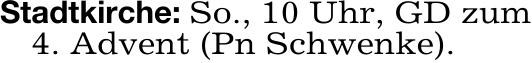 Stadtkirche: So., 10 Uhr, GD zum4. Advent (Pn Schwenke).