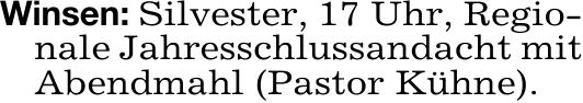 Winsen: Silvester, 17 Uhr, Regio-nale Jahresschlussandacht mit