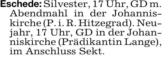 Eschede: Silvester, 17 Uhr, GD m.Abendmahl in der Johannis-