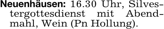Neuenhäusen: 16.30 Uhr, Silves-tergottesdienst mit Abend-