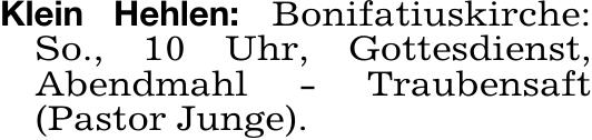 Klein Hehlen: Bonifatiuskirche:So., 10 Uhr,