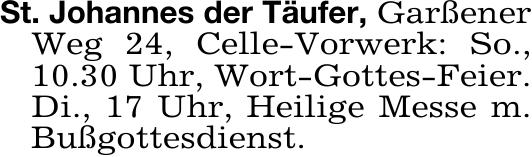St. Johannes der Täufer, GarßenerWeg 24, Celle-Vorwerk: So.,