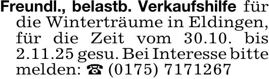 Freundl., belastb. Verkaufshilfe fürdie Winterträume in Eldingen,