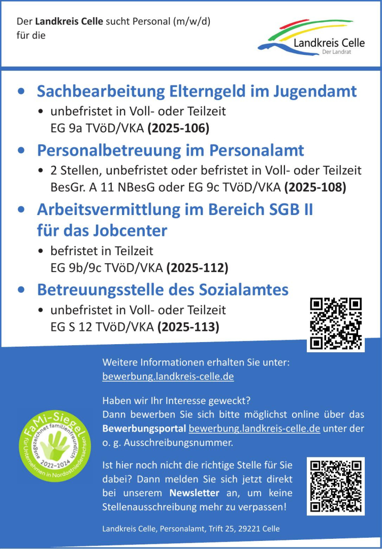 Der Landkreis Celle sucht Personal (m/w/d)für die