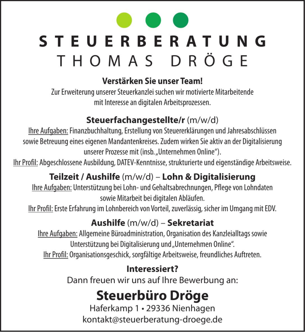Ihr Profil: Abgeschlossene Ausbildung, DATEV-Kenntnisse, strukturierte und eigenständige Arbeitsweise.