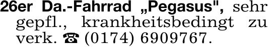 26er Da.-Fahrrad „Pegasus", sehrgepfl., krankheitsbedingt zu